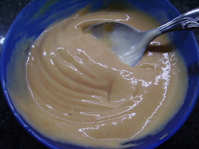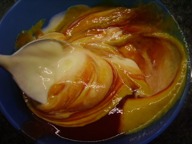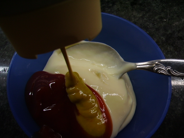4.- Añadimos a la mayonesa,, la cuchara de tomate y la mostaza, removemos hasta homogeneizar colores y obtener la salsa rosa.