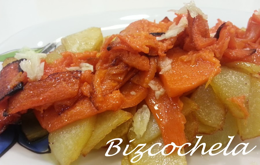 5. - Sacamos la calabaza del horno cuando estén doradas. Y las pondremos sobre las patatas y volvemos a sazonar un poco más.