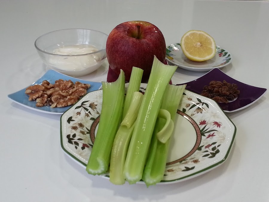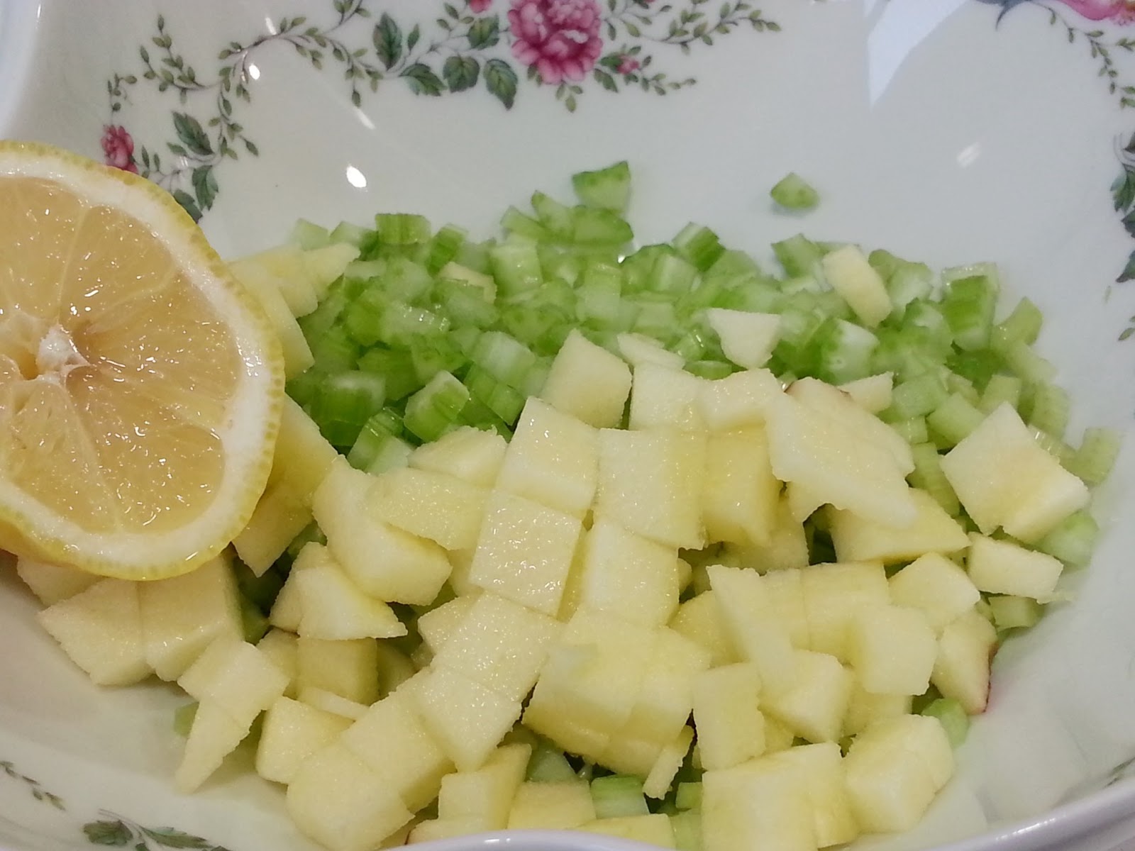2. - La manzana la cortamos en dados pequeños y mezclamos con el apio, y rociaremos con el jugo del limón para que no se oscurezca.