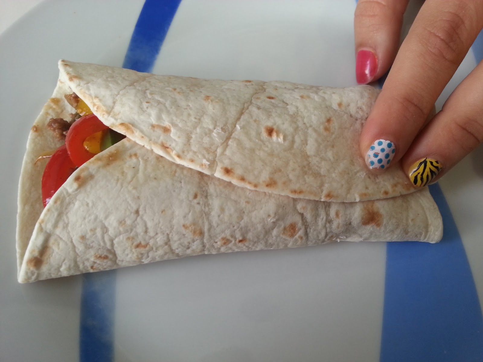 6. - Ponemos unas fajitas en el plato, podemos meterla en el microondas 10 segundos, o directamente, y ponemos el relleno encima.