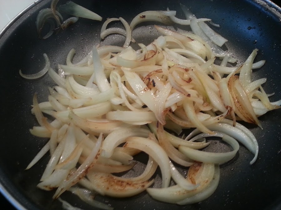 2. - Mientras cortamos la cebolla , yo la corto en tiras largas. Y las ponemos en otra sartén a dorar con un poco de aceite.