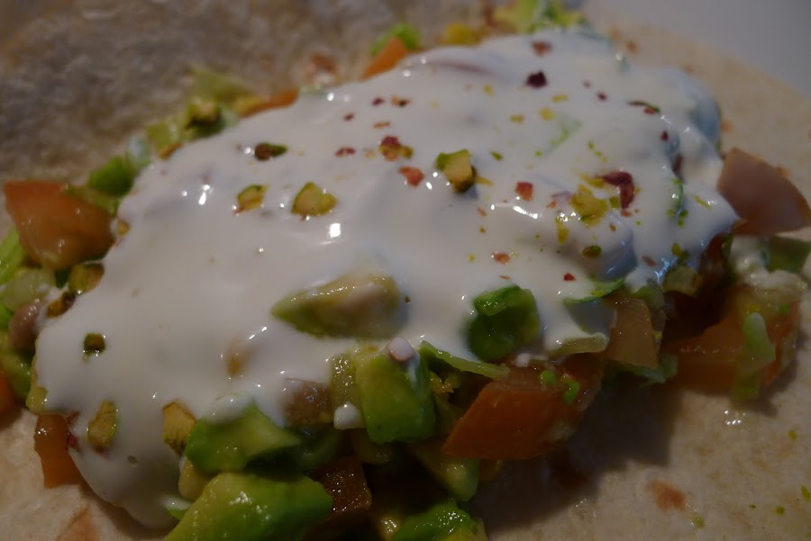 Ahora para la salsa de yogur,mezclamos las 4 cucharadas de mayonesa con el yogur y echamos sobre la ensalada la cantidad que nos apetezca,espolvoreamos con los pistachos picaditos y cerramos cada tortilla con un palillo o de la forma que se nos ocurra.Listo,ya teneis solucionada una cenita rapida ,sana y deliciosa,que os parece?