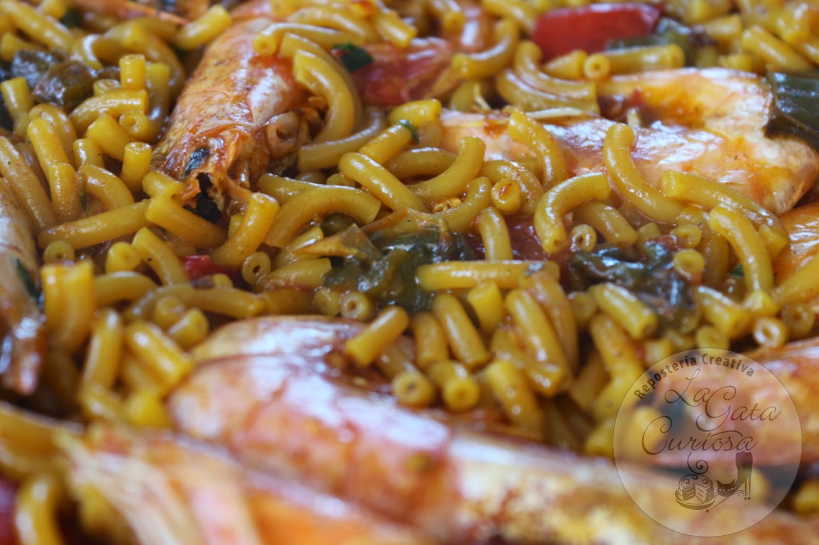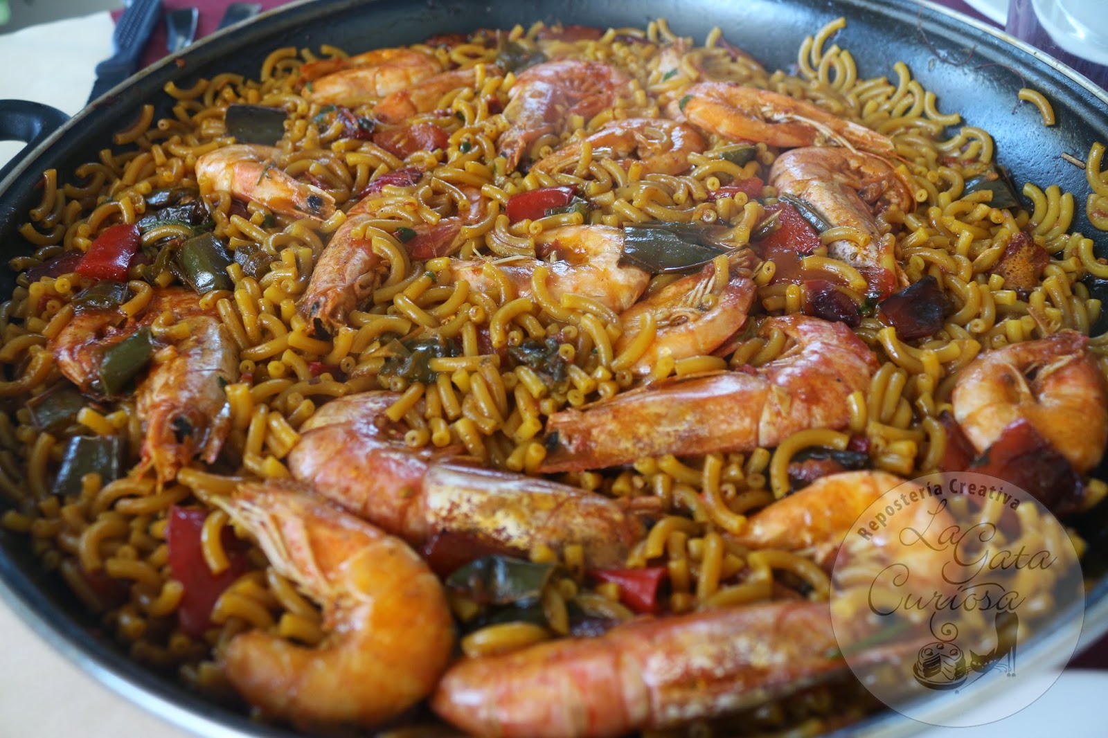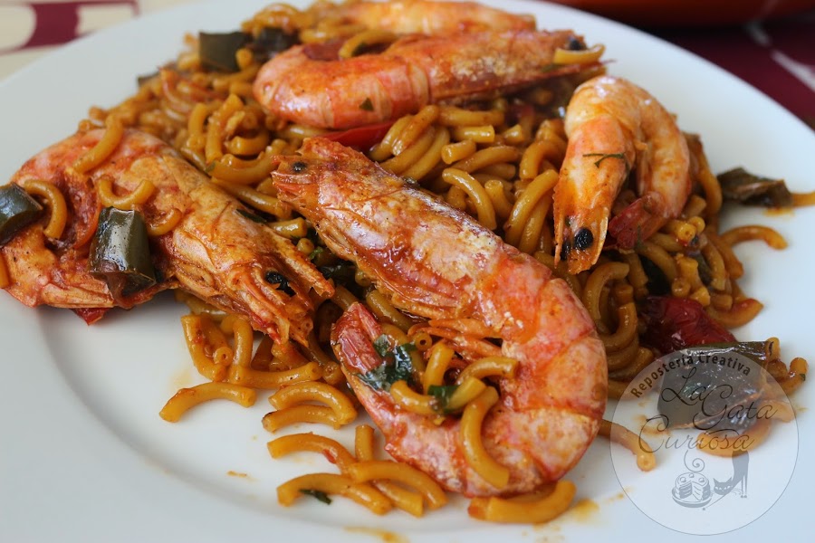 En el mismo aceite pondremos los pimientos partidos en trozos pequeños, dejamos cocinar a fuego medio bajo hasta que se empiecen a dorar, cuando los pimientos estén listos añadimos el tomate rallado, dejamos que se cocine hasta que pierda toda el agua, en ese momento pondremos el pimentón, le damos unas vueltas, añadimos los fideos. Hacemos un picado con el ajo, el perejil y el azafrán si es que lo usamos, lo volcamos en la paellera, colocamos de nuevo las gambas y los langostinos, cubrimos con el caldo caliente y dejamos hasta que la pasta esté hecha (esto depende un poco del gusto personal de cada uno, pero lo mejor es que sigáis las indicaciones del fabricante)