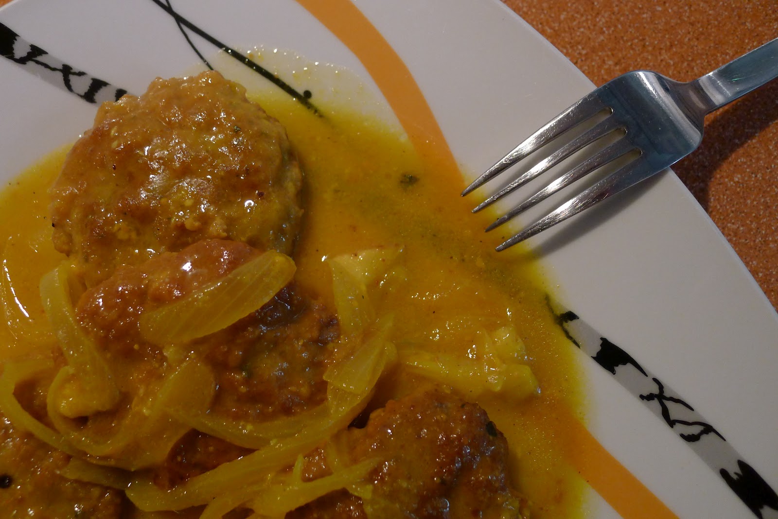 Pochamos la cebolla cortada en juliana,de forma que nos quede blandita,añadimos los filetitos,el vino blanco,el majado de almendras y un poco de agua hasta cubrir la carne y dejamos hacer unos 20 minutos.A mitad de coccion salaremos o añadiremos el avecrem y un poco del colorante o azafran.