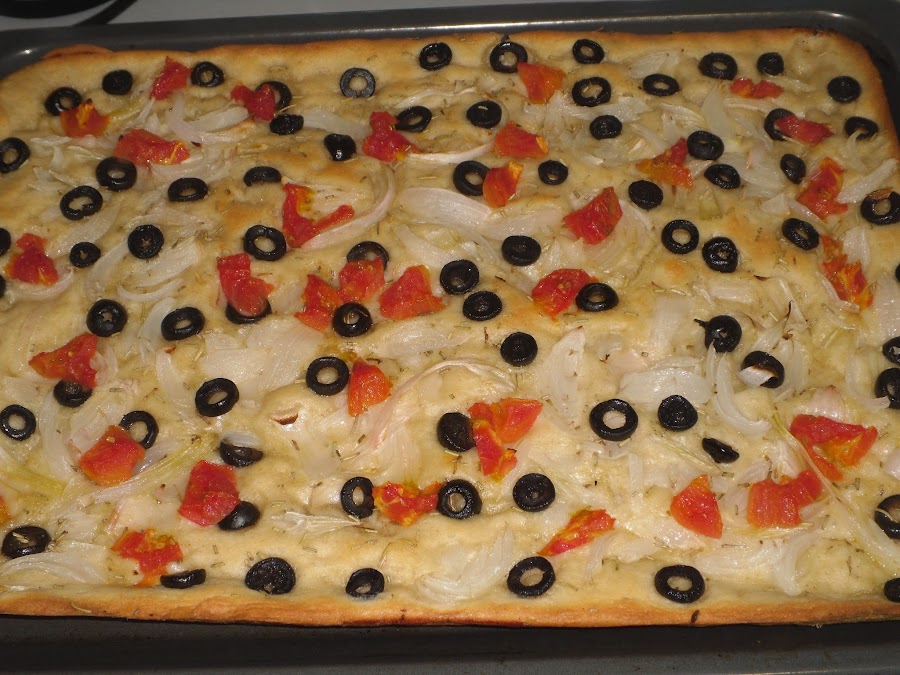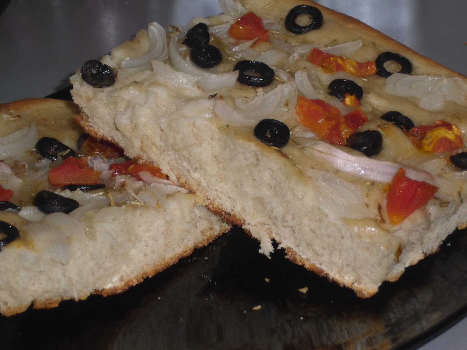 Es una especie de pan cubierto con hierbas (romero, orégano?) y otros productos como cebolla o tomate.