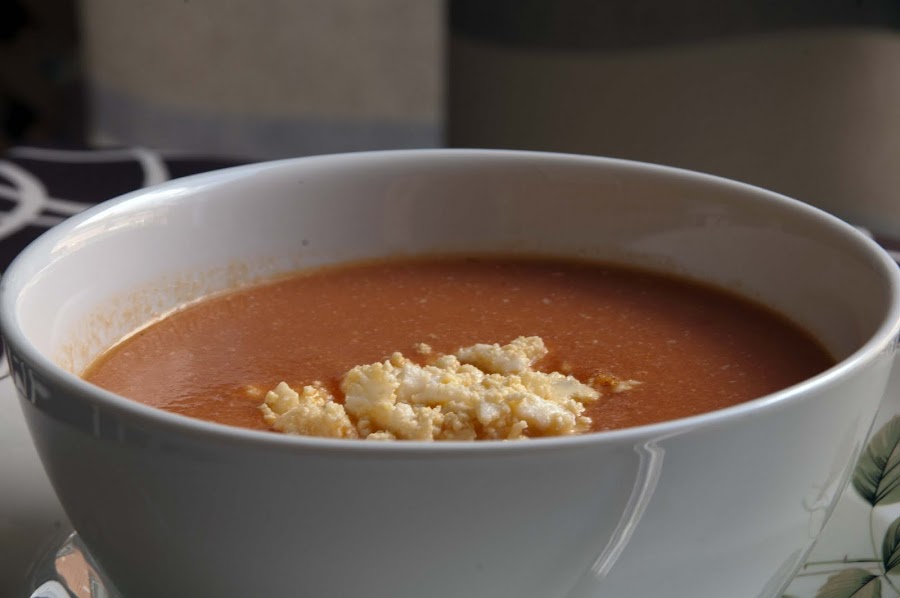 Es muy fácil, trituramos todos los ingredientes menos unos de los huevos cocidos, pasamos por un chino para quitar las pepitas y las pieles.