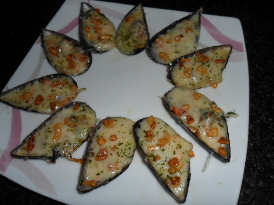 4º - Ahora rellenamos las cáscaras con la carne de mejillón y bastante mozzarellla . Metemos al microondas porque el queso mermará bastante . Volvemos a cubrir con más queso y los metemos al horno dentro de una fuente hasta que se funda el queso del todo .