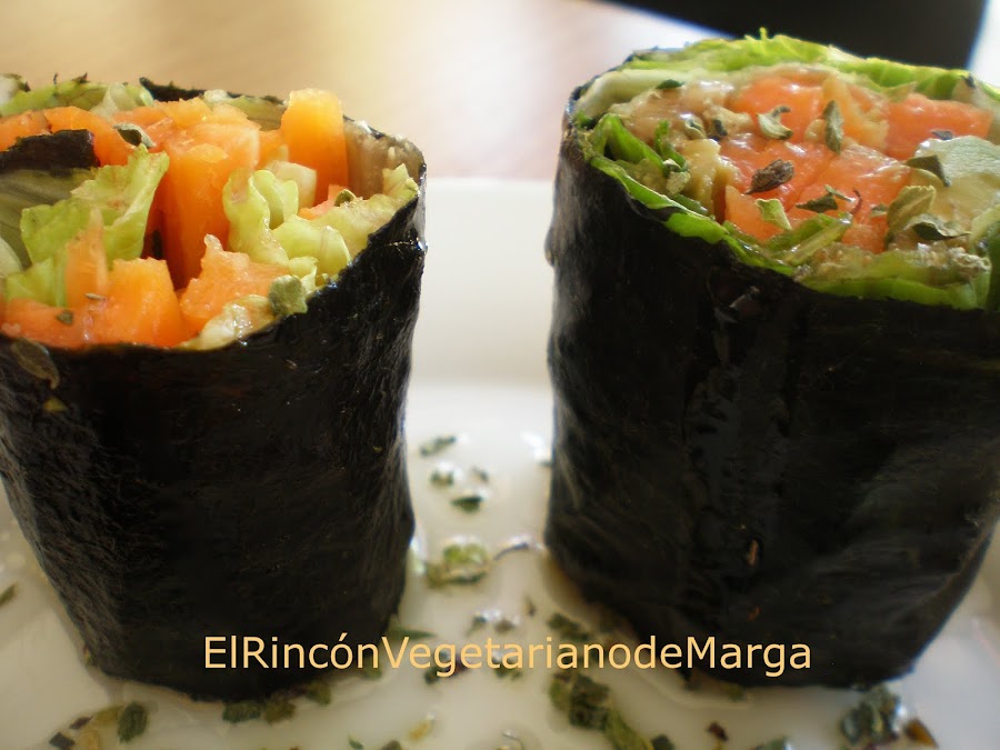 Extendemos la hoja de alga nori encima de una esterilla de bambú (si no se tiene no pasa nada, es sólo porque ayuda a prensar bien el rollito). Limpiamos las hojas de lechuga y le quitamos la parte dura de cada hoja. Ponemos dos hojas de lechuga encima del alga, seguidamente pelamos las zanahorias y el aguacate y los cortamos en láminas finas, tambien las ponemos encima de las hojas de lechuga y por último lo rocíamos con un pelín de aceite de oliva, sal y orégano. Enrollamos apretando bien, para que quede el interior compacto y prensado y al llegar al extremo final y para sellar, mojamos el alga nori y la juntamos con el rollito. Dejamos que se compacte en la nevera unas horas y lo cortamos como nos guste.