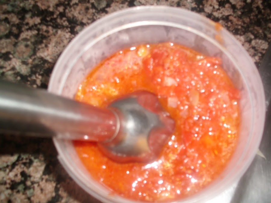 Si nos gusta encontrar los trocitos, mezclamos solamente, pero a mi hijo no le gustan los trocitos, asi que le paso la batidora a todo.