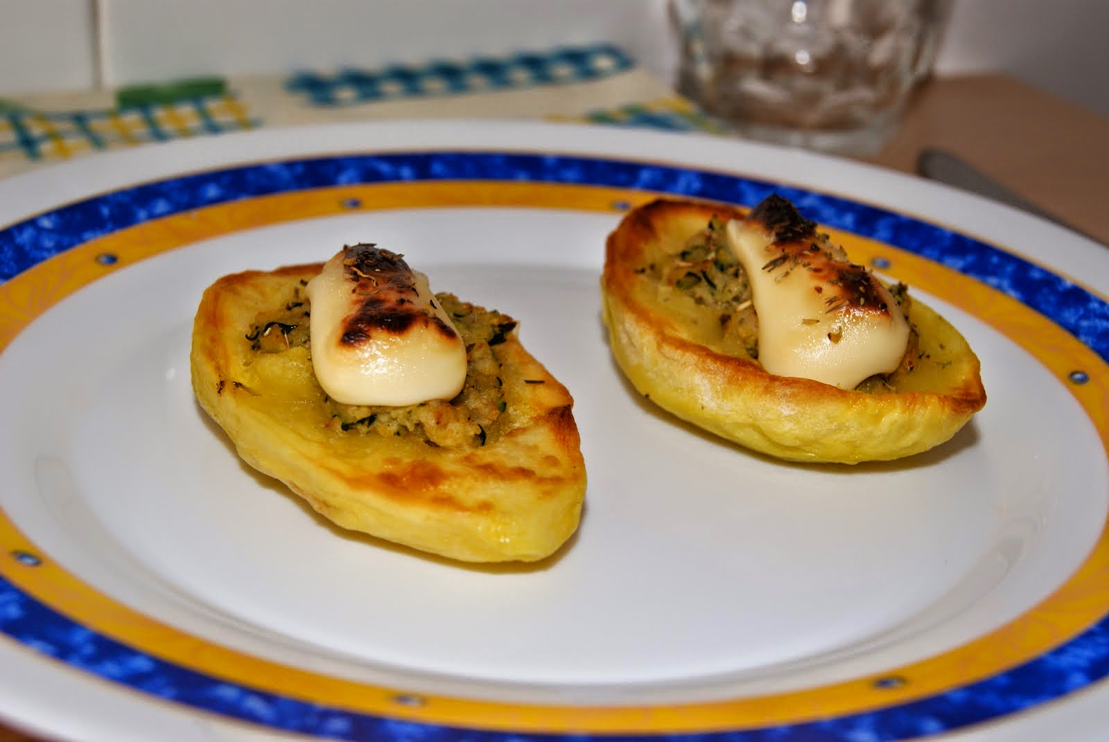 Encendemos el grill del horno a 180º C. Cortamos los quesitos por la mitad y colocamos un trozo en cada patata. Horneamos 10 minutos y servimos.