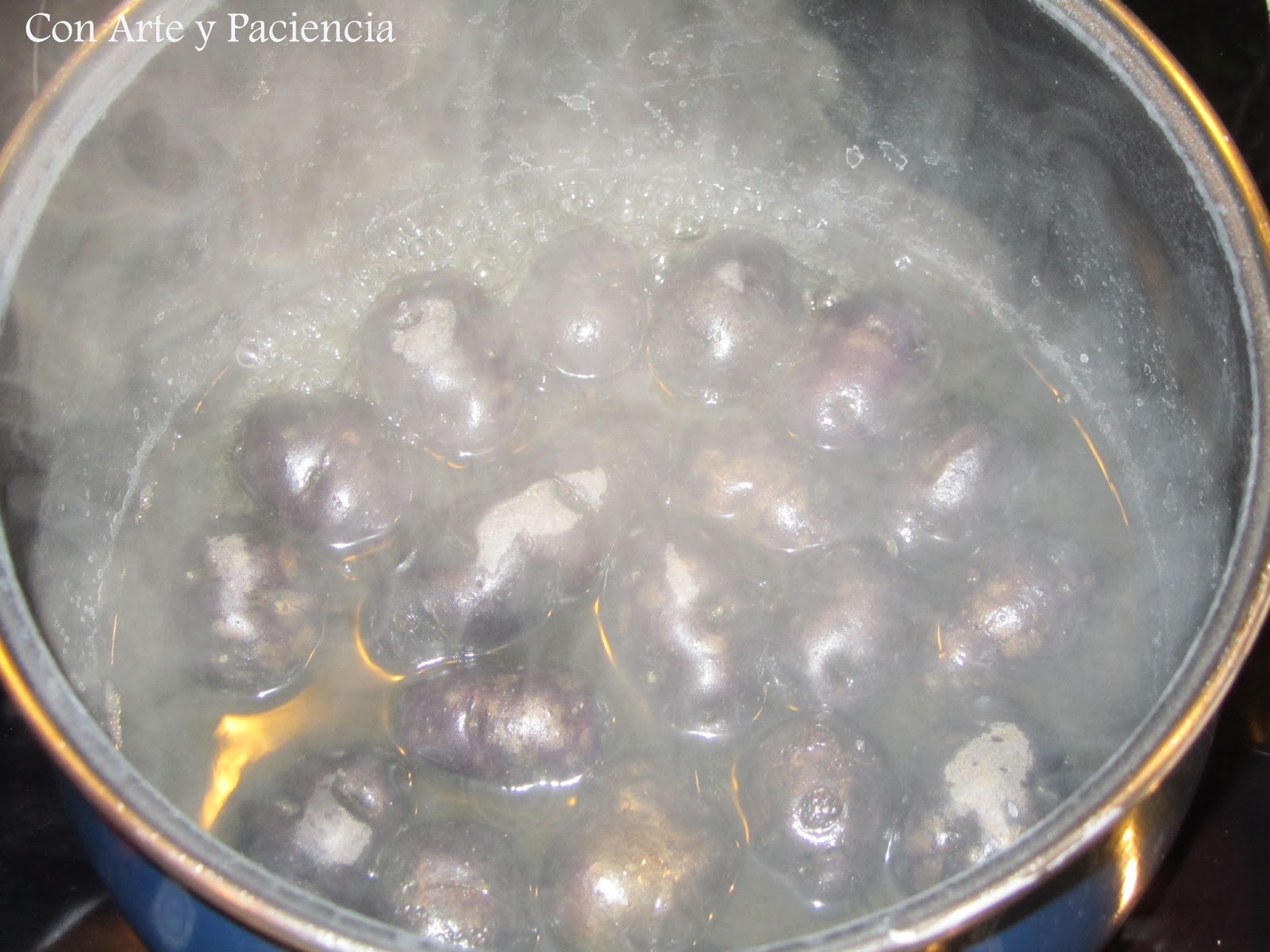 En una olla ponemos agua que no supere la altura de las patatas. Cuando rompe a hervimos añadimos las patatas y dos cucharadas de sal. Dejamos unos 7-9 minutos y retiramos.