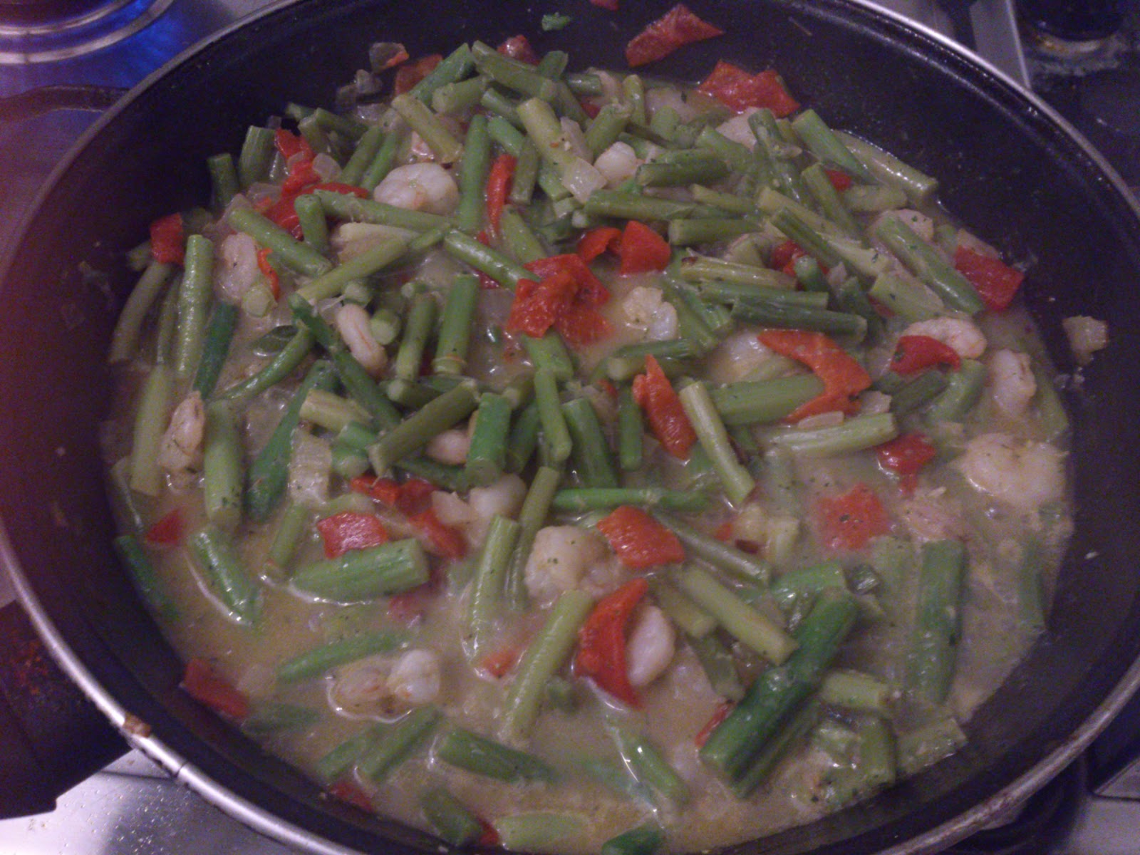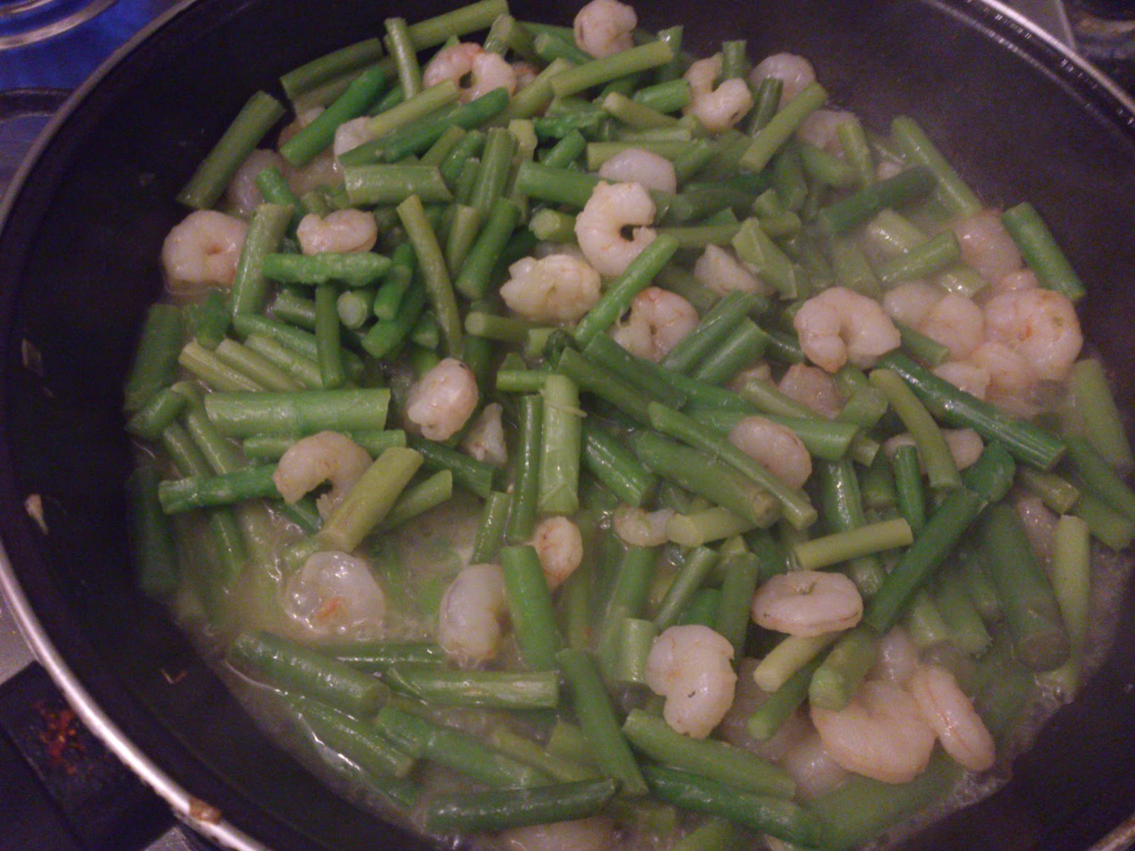 Ahora ponemos las gambas con los ajetes, hasta que suelten toda el agua del congelado.