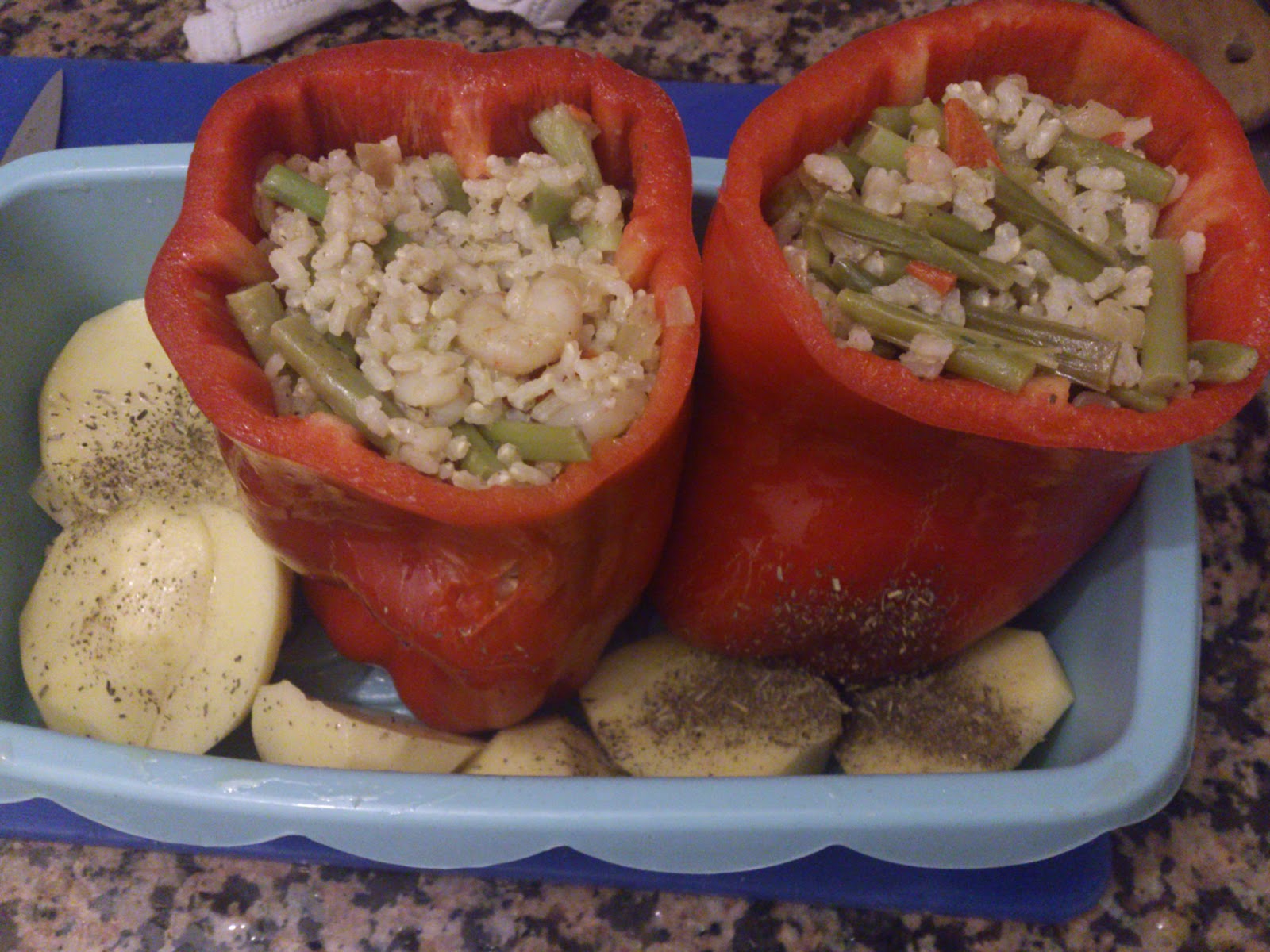 Una vez que no suelta más liquido, le añades la cebolla y el pimiento de piquillo, un poquito de nuez moscada,sal,perejil y un vaso del caldo de verduras,que teníamos reservado del arroz. Lo tienes unos 10 o 15 minutos. Después le añades el vino y 5 minutos más.. Una vez lo tengas todo, añades el arroz y le das un par de vueltas para que vaya cogiendo todo el sabor de los demás ingredientes. Preparas una fuente y le untas un poco de aceite, pincelas también los pimientos rojos, que habremos cortado por arriba como una tapa, le quitas las pepitas de dentro y los colocas en la fuente. Lo vamos rellenando de nuestra mezcla y le añadimos al molde también las patatas cortadas a rodajas con un poco de tomillo. Así aprovechamos el horno!!La tenemos unos 25 minutos al horno precalentado a 180º, si ves que necesitáis más tiempo, ya sabéis.. Unos minutos más, controlando no chamuscar vuestros pimientos. Una vez listos, añades a las patatas un poquito de pimentó dulce. Espero que disfrutéis de ellos!! ISA.