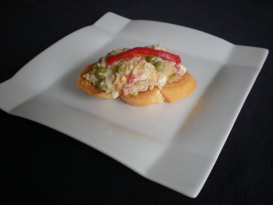 Se coloca sobre una rebanada de pan ya tostada, se decora con una tira de pimiento rojo y listo para comer !!!