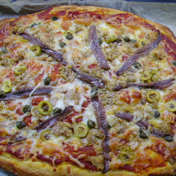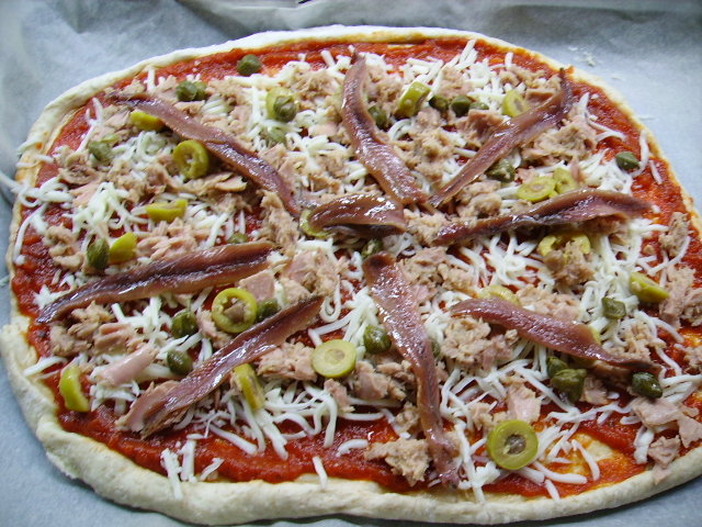 Y los ingredientes para rellenar esta nueva pizza son Anchoas, Atún, Aceitunas y Alcaparras al gusto.