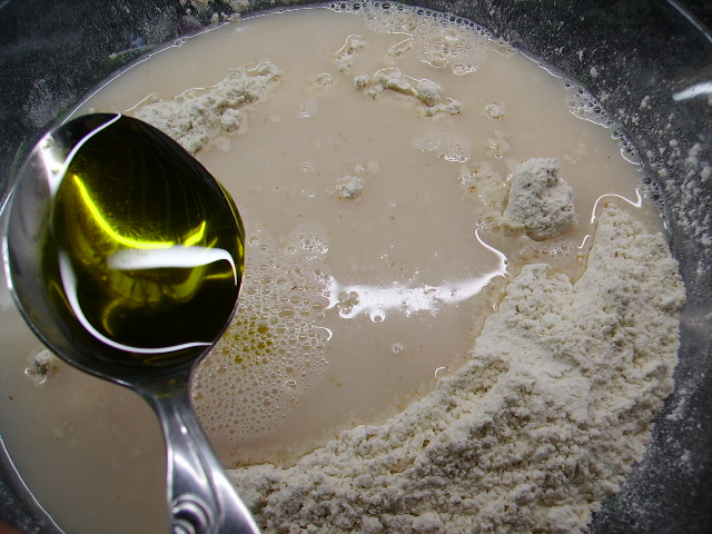 4.- Sumamos el agua con la levadura y las dos cucharadas de aceite.