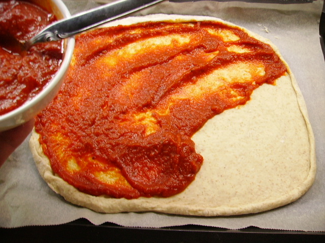 9.- Rellenamos primero con salsa de tomate para pizza. (para hacerla, dorar unas cebolletas muy picadas, agregar tomate frito triturado, orégano y mejorana)