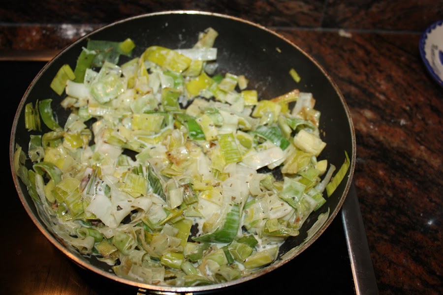 Sofreímos con unas gotas de aceite el puerro cortado y hierbas aromáticas unos cinco minutos. Le agregamos un chorreón de nata (crema de leche).