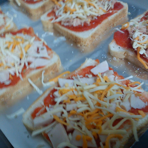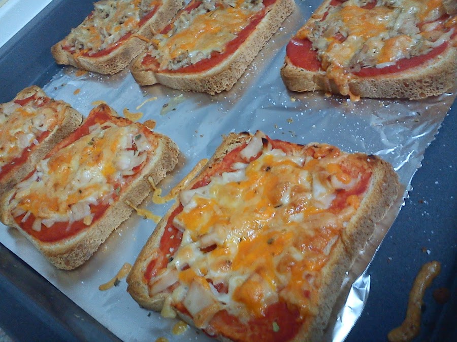 Ingredientes para None comensalespan de bagette,queso para pizza,beicon,atun,oregano,tomate frito se abre el pan por la mitad y se le unta con tomate frito,se espolvorea de oregano y se pone un poquitín de queso rallado, encima atún escurrido y beicon en trocitos, se cubre de queso rallado y al horno a unos 170º hasta que el queso esté derretido y dorado. se puede rellenar de lo que sea, sie ...