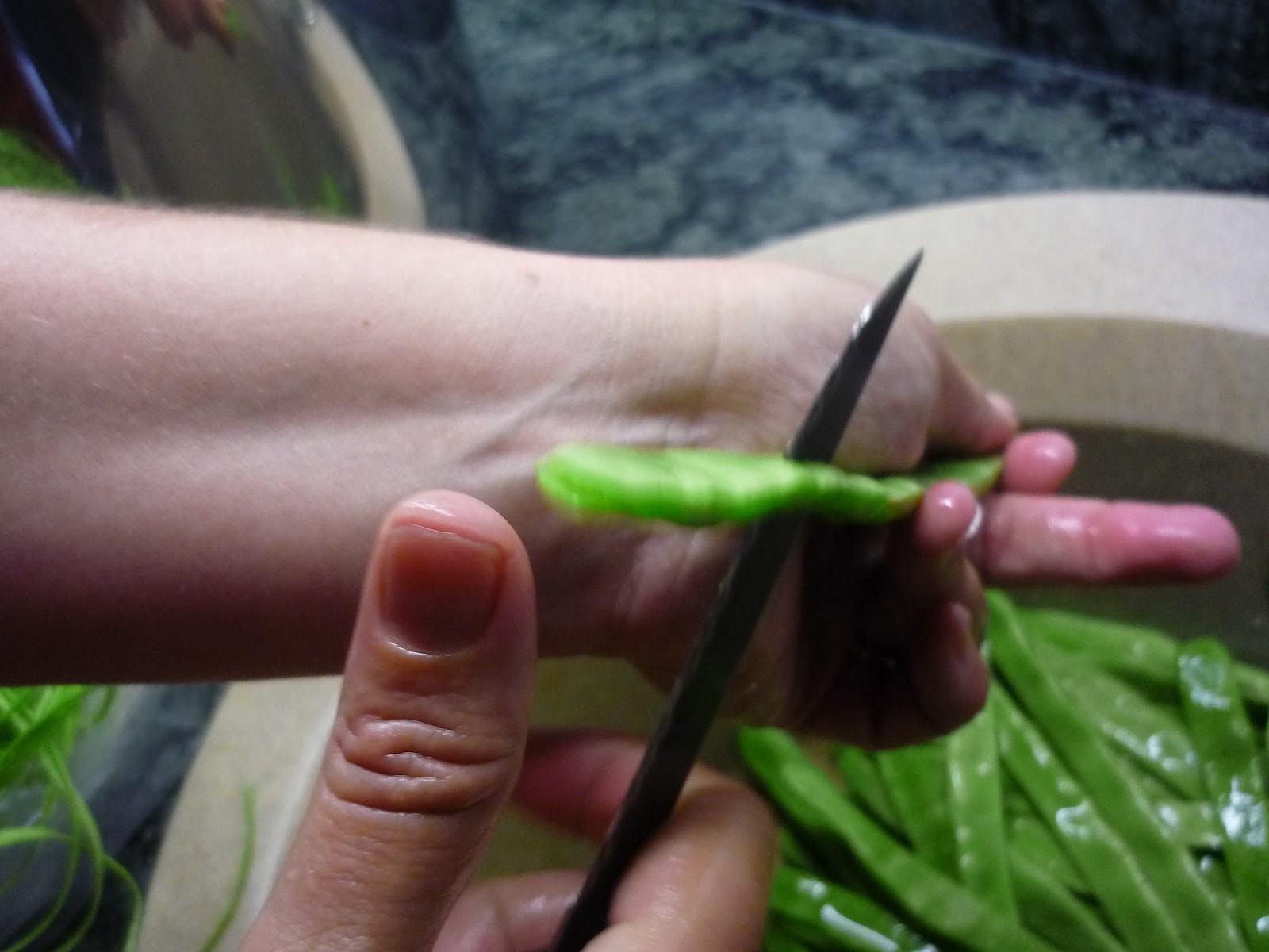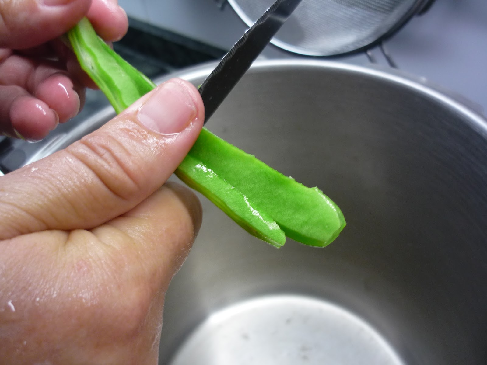2.- Pelar las habichuelas quitando las hebras laterales. Cortarlas en juliana.
