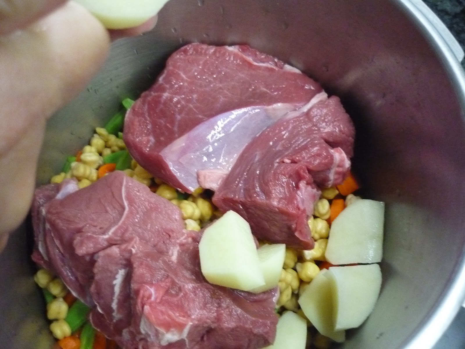 3.- Ponemos en la olla rápida, las habichuelas, los garbanzos, la zanahoria pelada y cortada en rodajas, las patatas en gajos y la carne entera.