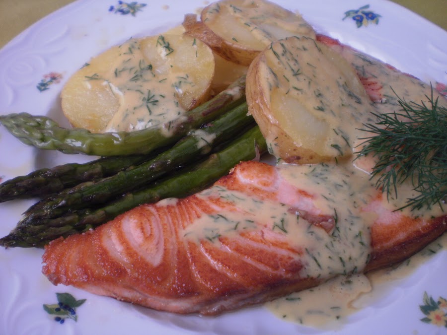 Salar al gusto y servir con la salsa de eneldo.