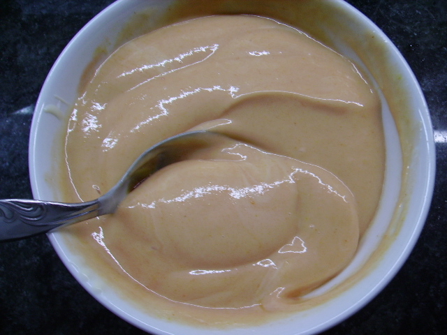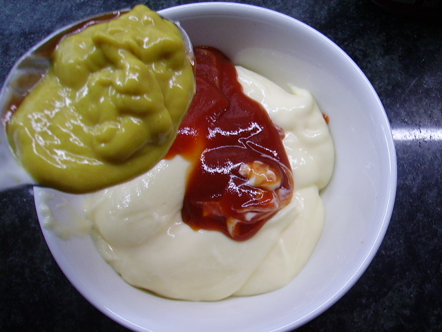 4.- En un bol mezclamos la mayonesa con el ketchup y la mostaza, removemos y si queremos dar más color agregamos mas ketchup.