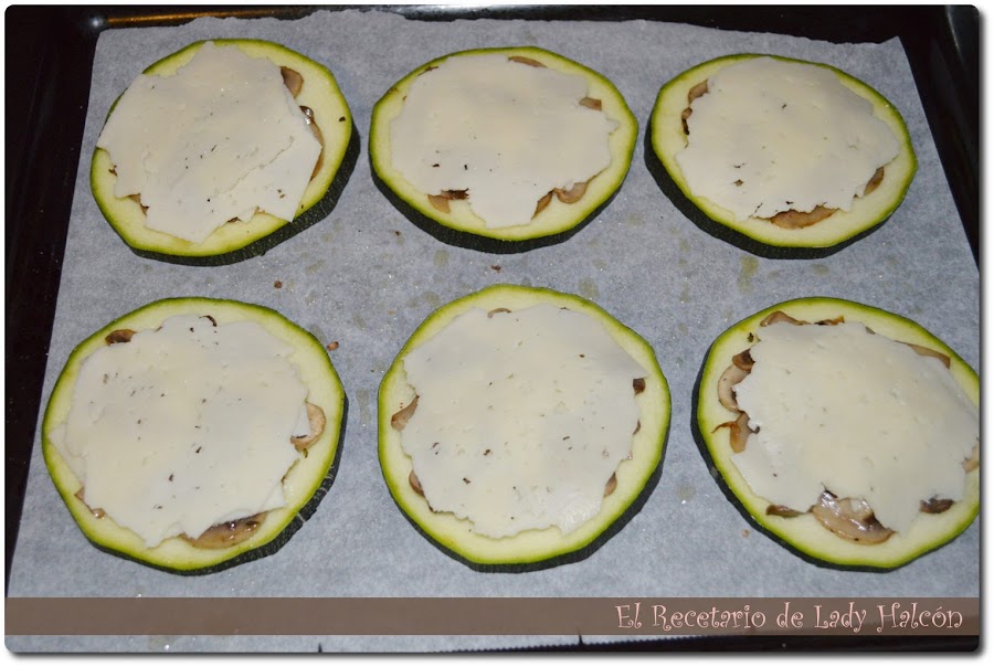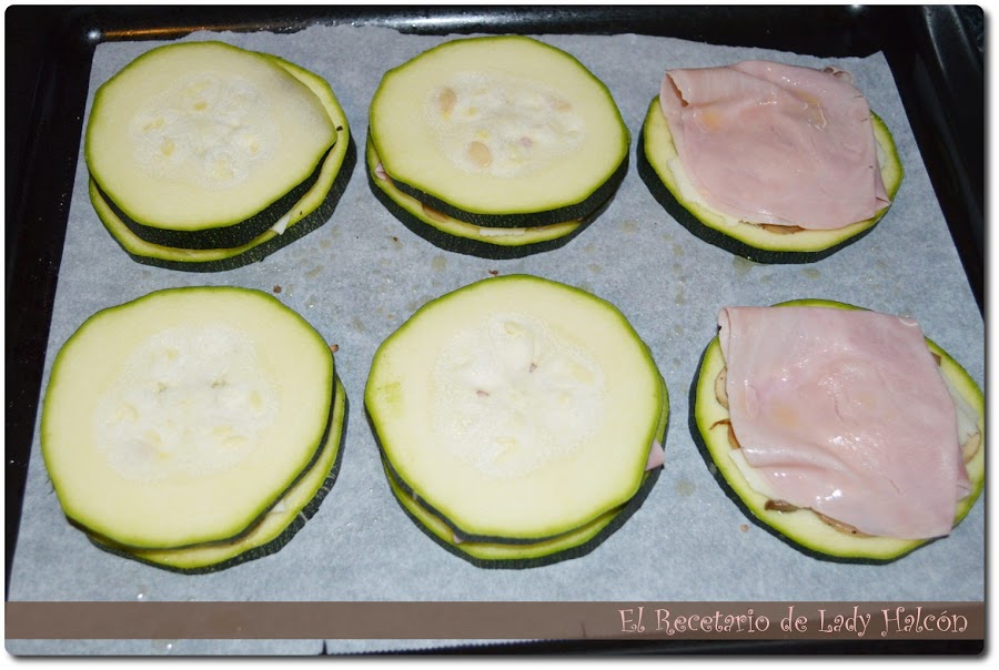 Lava el calabacín y corta doce rodajas gorditas para que no se rompa. Coloca seis sobre la bandeja y reserva las otras seis.