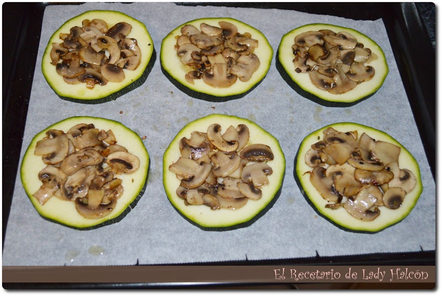 Sobre cada rodaja de calabacín echa sal y pimienta y coloca un puñado de champiñones hasta que repartas todos los que has cocinado antes.