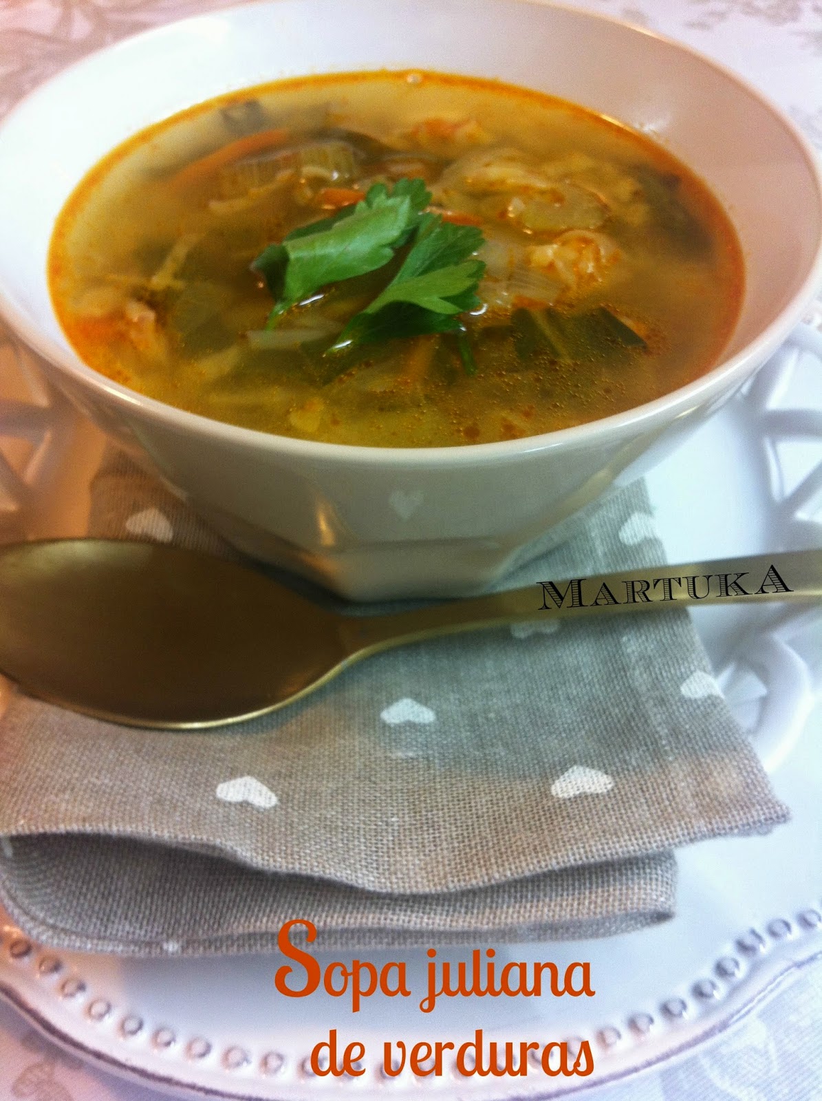 perejilEl nombre de juliana no se refiere a la inventora de la sopa en cuestión, sino al corte de las verduras en bastones finos.