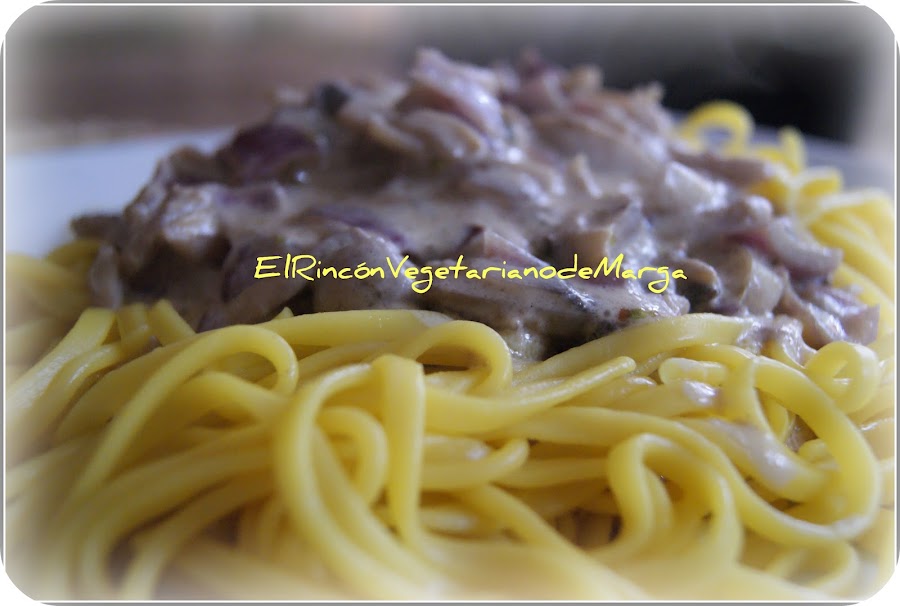 La receta que hoy; una receta muy fácil de hacer, pero con un sabor distinto, ya que son tallarines con sabor a cúrcuma (o quien lo prefiera, curry) y con una carbonara de cebolla morada, champiñones y nata (crema de leche) de avena. Espero que os guste. Los tallarines mucho mejor si son integrales, ya que aportan más nutrientes y fibra, lo que a mi hoy no me quedaban. Me ha gustado mucho el contraste del amarillo de los tallarines con la salsa color morado.