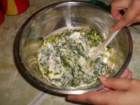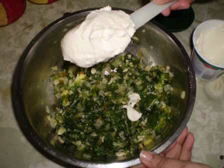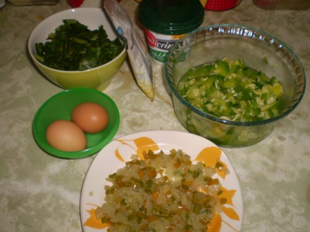 En un bol mezclamos: la acelga, los zapallitos, la cebolla.