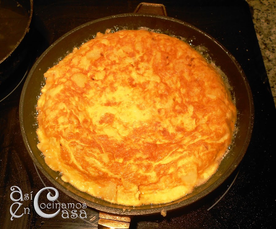 Cuando veamos que ya puede estar dorada por la parte de abajo, toca darle la vuelta a la tortilla. Darle la vuelta es otra de las cosas, podríamos decir, delicadas. Yo utilizo una bandeja grande completamente plana que tengo; la pongo bocabajo encima de la sartén, doy la vuelta rápidamente (ojo que no es fácil) y ayudándome de un tenedor devuelvo la tortilla a la sartén.