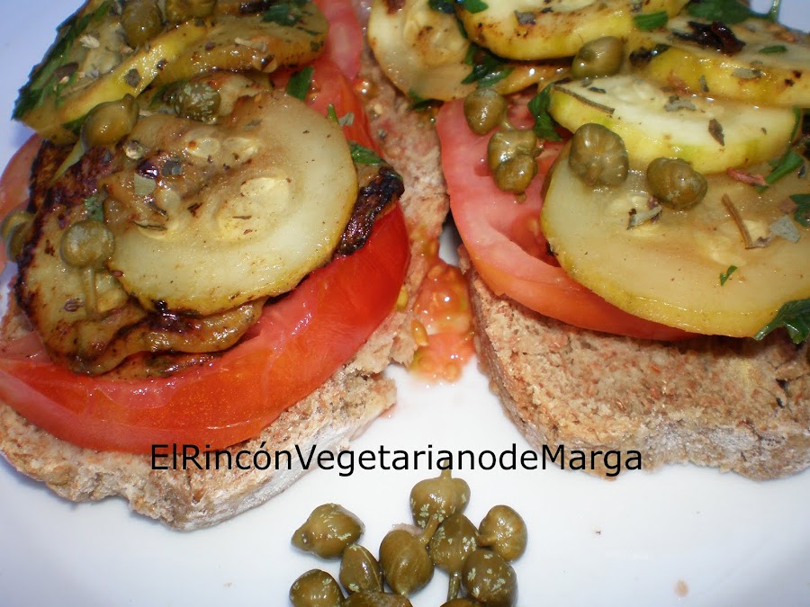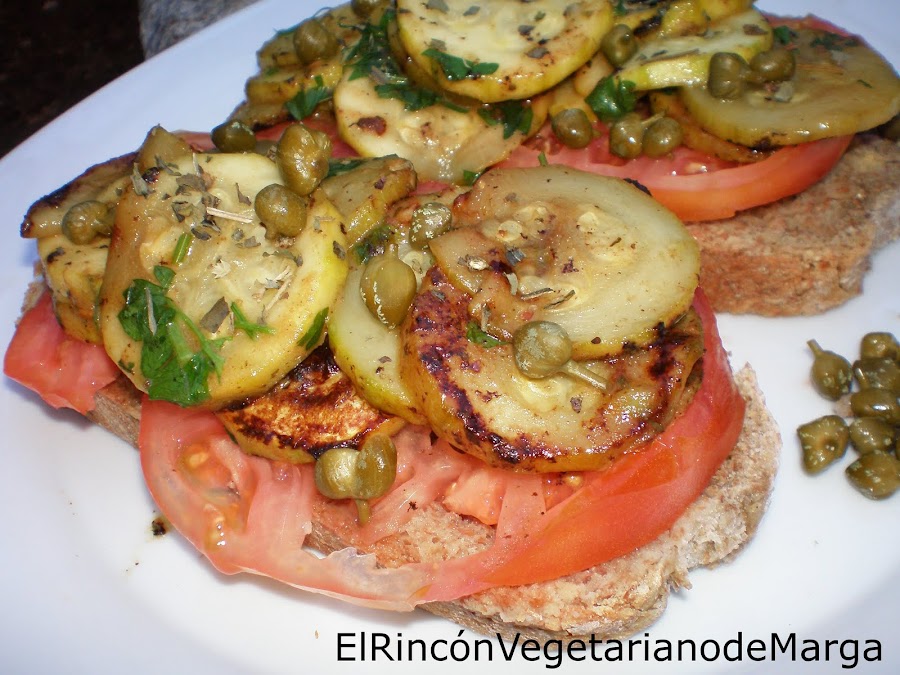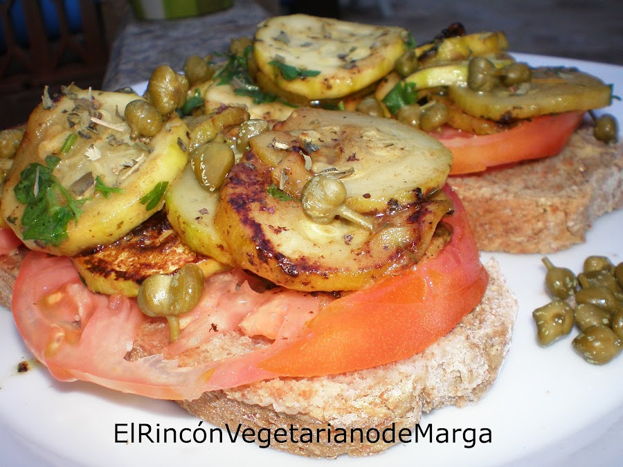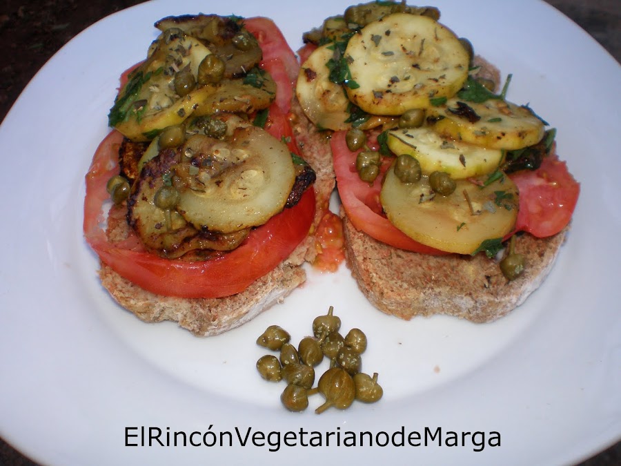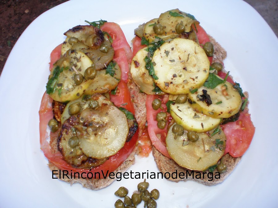 Pan moreno integral, 2 calabacines, 1 tomate grande, un puñado de alcaparras, perejil fresco, sal marina y orégano seco, aceite de oliva virgen.