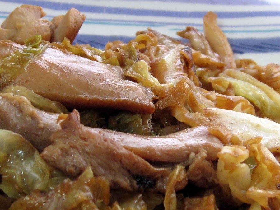 Ponemos un par de cucharadas de aceite de sésamo, sacamos el pollo del adobo, escurrimos y reservamos el adobo. Cuando el pollo este dorado le incorporamos la col y dejamos que se haga durante unos minutos. Por último le añadimos el adobo, damos unas vueltas para mezclar todo bien y ya tenemos listo nuestro work de col con pollo......