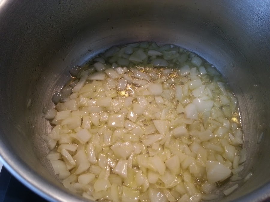 6. - Y nos ponemos con la salsa: Cortamos la cebolla finita y la ponemos al fuego con un poco de aceite.