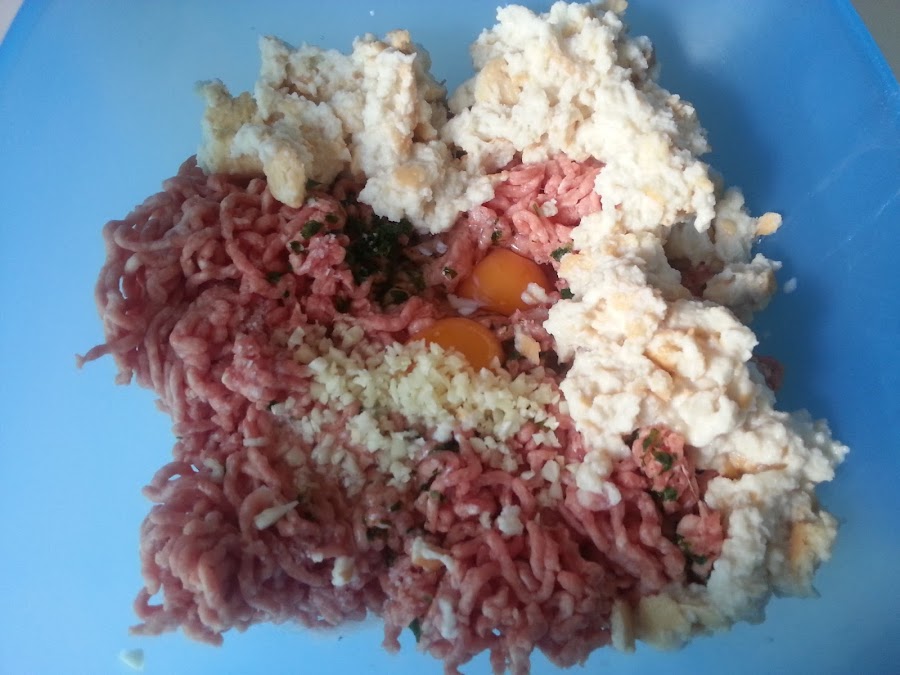 2. - Echamos en bol todos los ingredientes restantes junto con el pan, pero sin escurrirlo mucho, y amasamos bien todo.