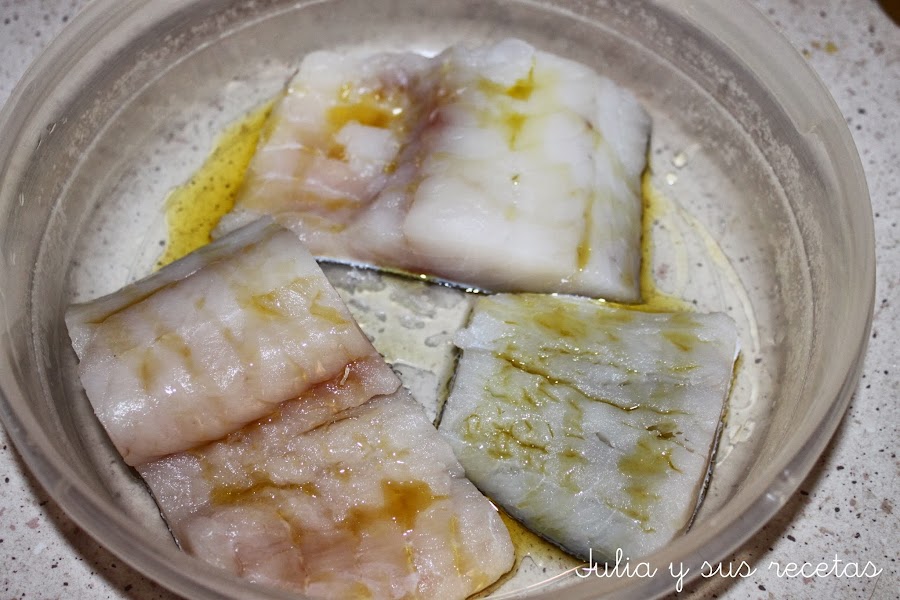 Ponemos el aceite en un recipiente apto para el microondas, colocamos el bacalao encima con un chorreón de aceite.
