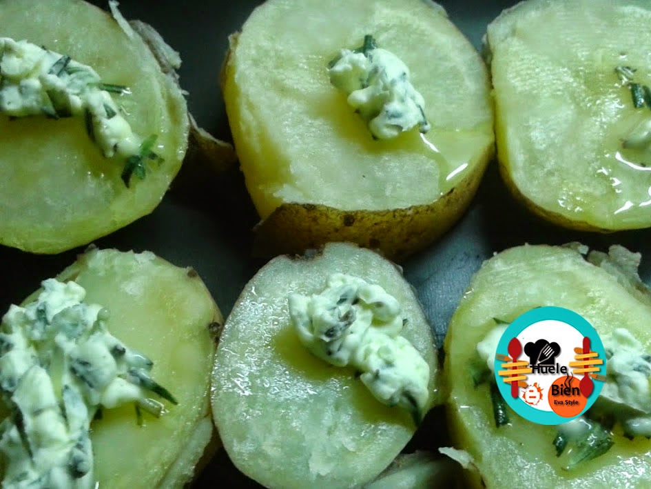 4.- Ponemos a cocer las patatas con la piel en agua y sal durante 20 minutos, hasta que estén tiernas. Las cortamos en rodajas. Preparamos la margarina con las hojas de romero picadas, salpimentamos al gusto.