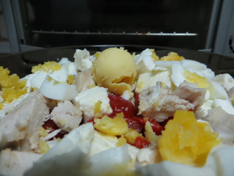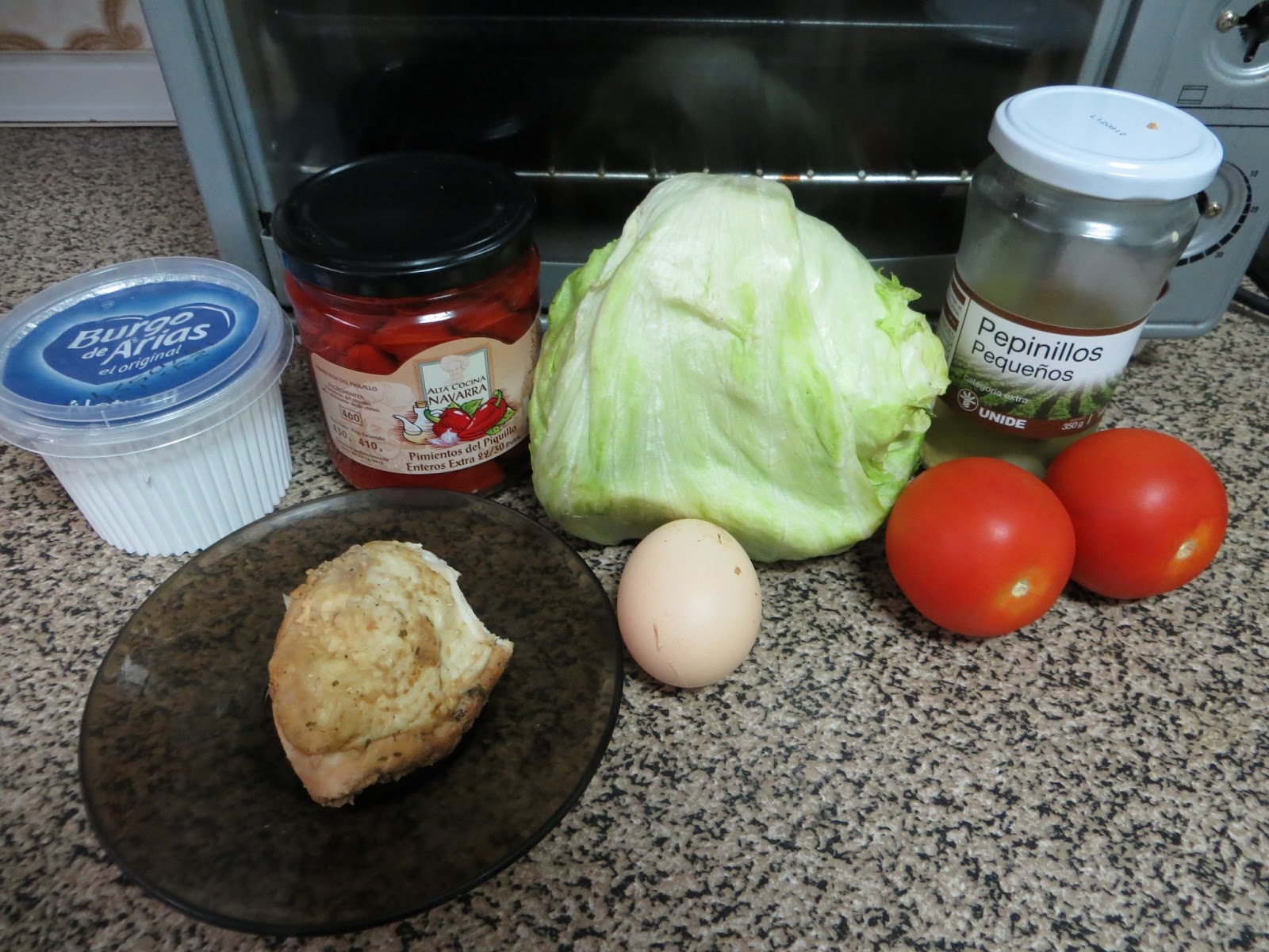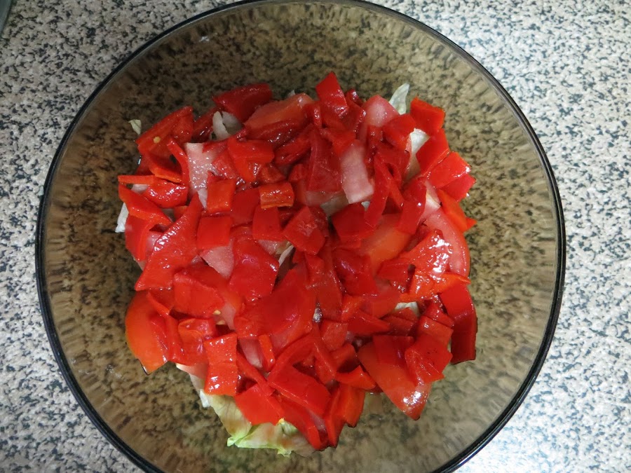 Lo primero que hacéis es trocear los ingredientes. Comenzáis por la lechuga, seguís por los pimientos, los tomates y los pepinillos. A continuación, escurrís bien el queso fresco y lo añadís, así como los trozos de pollo totalmente deshuesado, tened esto en cuenta porque si alguien se encuentra un trozo de hueso puede ser bastante desagradable. Lo último es añadir los dos huevos cocidos.