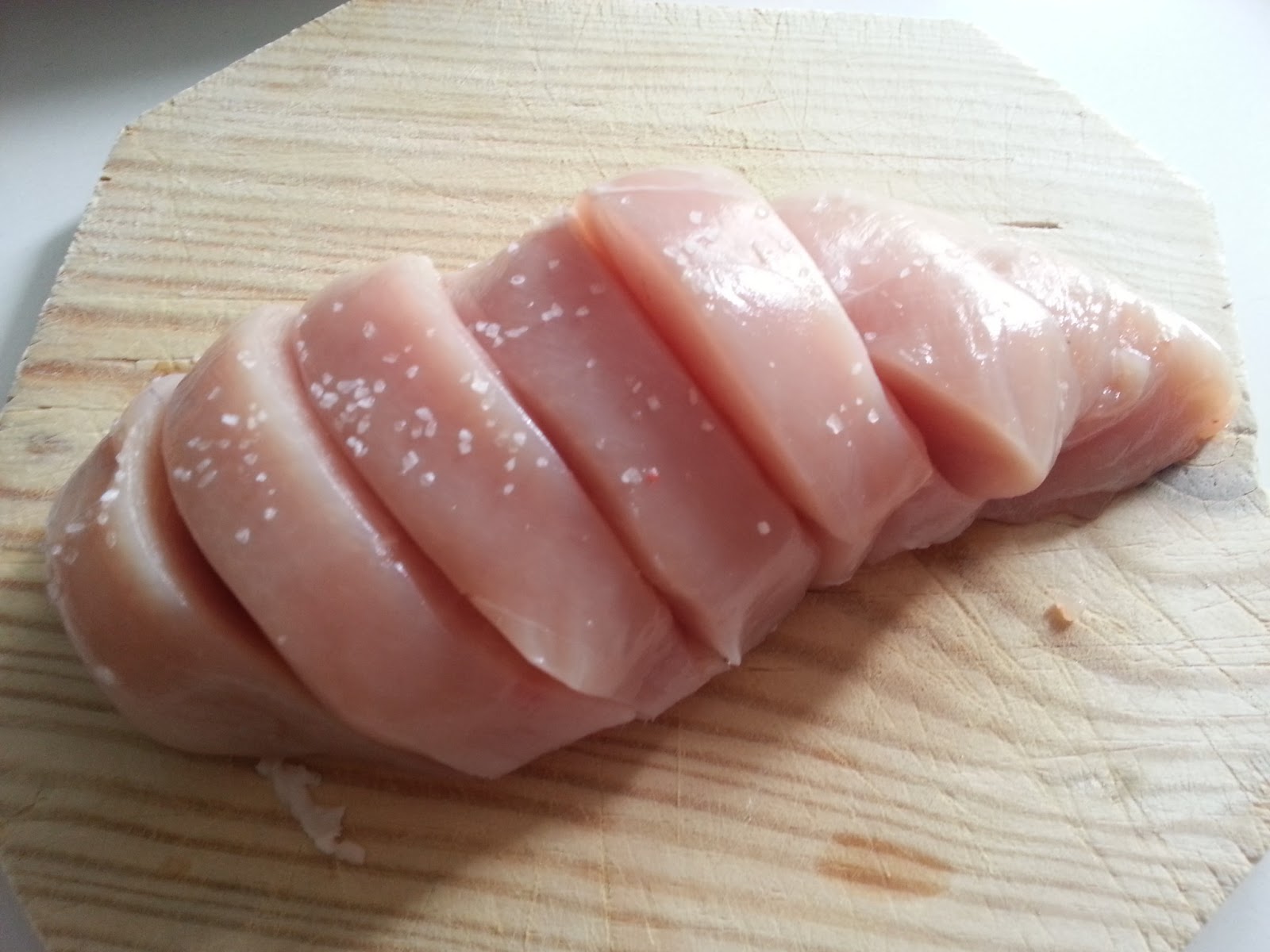 1. - Encendemos el horno a 200º y cortamos las pechugas en lonchas gruesas, sin llegar a cortar el final de abajo, que quede unida.