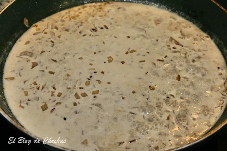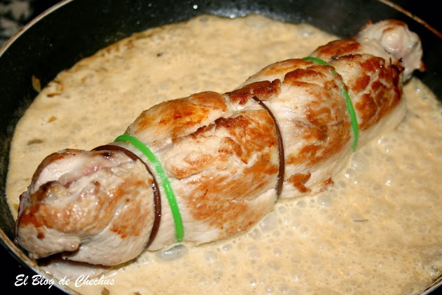Una vez pochada la cebolla añadimos el cognac, el caldo y luego la nata (crema de leche) , y dejamos reducir un poco. Añadimos de nuevo los solomillos y dejamos cocer a fuego muy lento durante unos 10 minutos. Servir muy caliente.