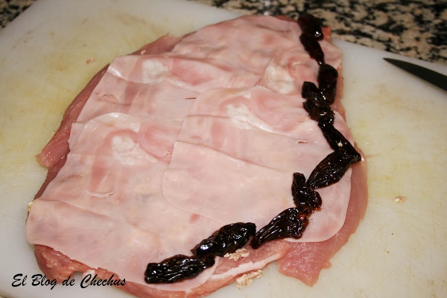 Primero abrimos los solomillos lo máximo posible en forma de libro. Cubrimos con el foie gras y luego cubrimos con las lonchas de jamón de york. En un lateral del solomillo ponemos los dátiles en fila. Cerramos apretando bien, volviendo a dar al solomillo la forma inicial. Cerramos con palillos o con gomas de silicona.