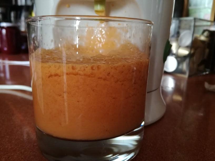 Pon el licuado de albaricoque en un bol y echa una cucharada de lecitina de soja. Pon la batidora a modo fuerte y sin mover, espera y verás como se hace un ligero aire.