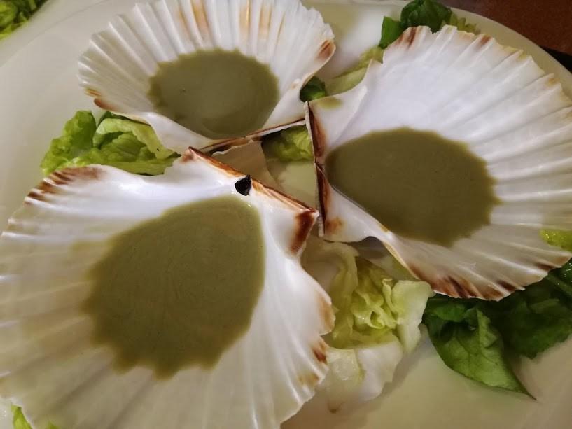 Coloca unas hojas de lechuga en el fondo, para que no bailen las conchas de las vieiras.
