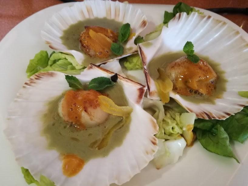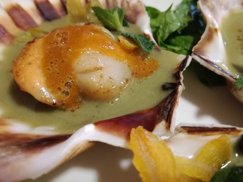 Coloca encima de cada vieira, un poco del aire licuado de albaricoque.