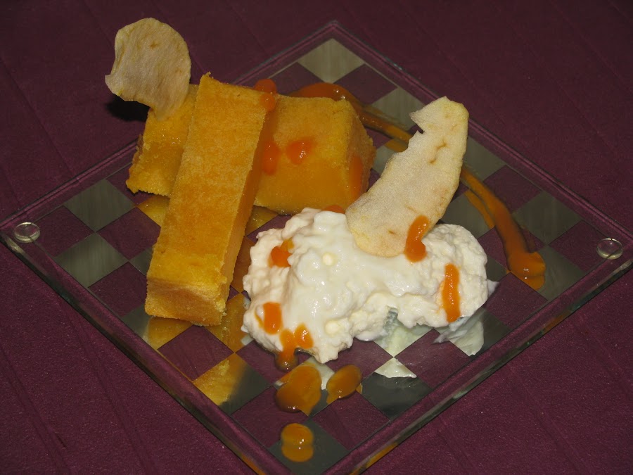 Ahora solo queda el montaje del plato.Un par de trozos de blondie, una cucharada generosa de mousse,un poco de manzana para darle el toque crunch y pintar ligeramente con la mermelada.