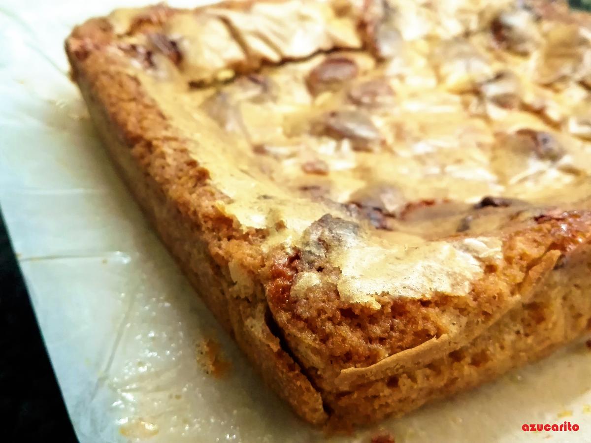 Nota: Si veis que el blondie queda un poco aceitoso, no os preocupeis, es por causa de las nubes. Sacarle el papel vegetal cuando esté casi frío y ponerlo sobre papel de cocina para que absorba toda el aceite que le sobre.