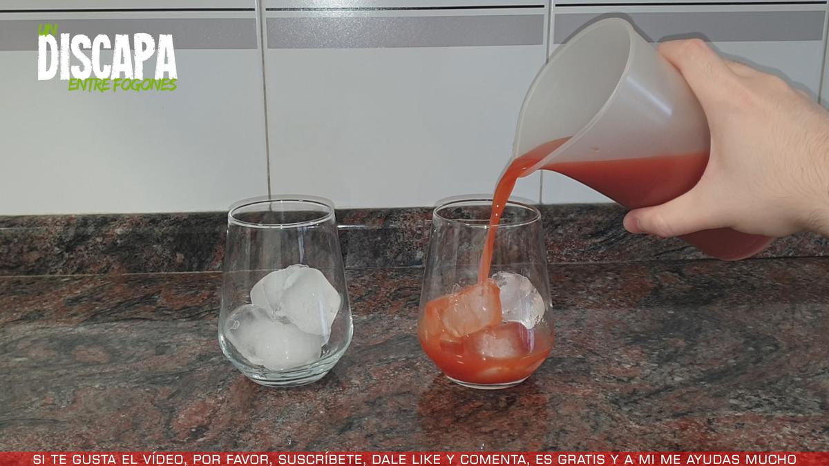 1En un vaso batidor añadimos el zumo de tomate, el vodka, el zumo de limón, 2 cucharaditas de salsa inglesa, una pizca de sal, unas gotas de tabasco y una pizca de pimienta negra.