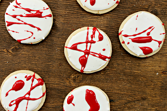 Mojamos un pincel en la glasa roja y salpicamos las galletas teniendo cuidado de colocarlas antes sobre un papel para evitar el momento desaguisado-masacre en la encimera de la cocina.